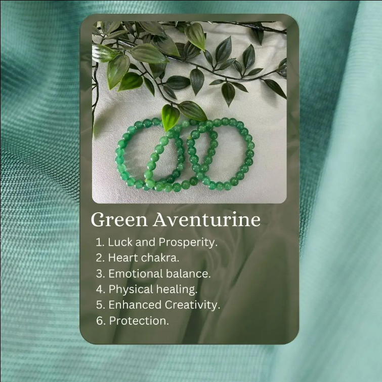 Wearing a green aventurine bracelet is often associated with a range of metaphysical and healing benefits. Here are some of the key benefits attributed to Green aventurine bracelets: